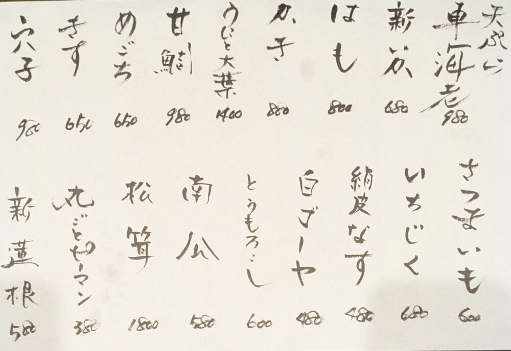 |  天ぷら(旬の食材・活車海老など) | 300円〜 |
